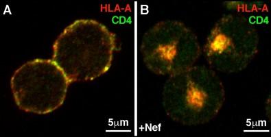image: Panel A shows the normal distribution of CD4 (green) and MHC-I (HLA, stained red) in T-lymphocytes. Panel B shows the change in distribution of these two proteins in a T-lymphocyte also expressing the HIV protein Nef