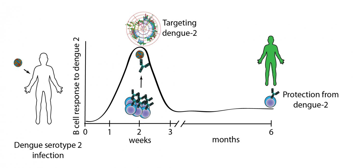 image: This graphic illustrates that the B cell response containing antibodies that target dengue serotype 2 appear two weeks after a dengue serotype 2 infection in humans and are still present 6 months after infection. Such B cells are important players in long-term protection from future dengue 2 infections.