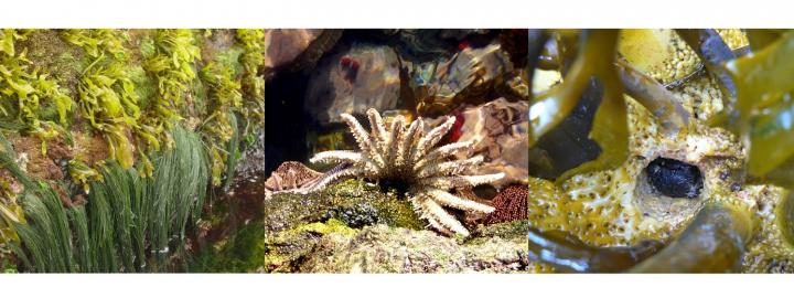image: Example of the diversity of interaction types linking species in nature. Left: algae competiting for space on the shore. Middle: sea star (heliaster) searching for food. Right: crab hiding in a kelp.