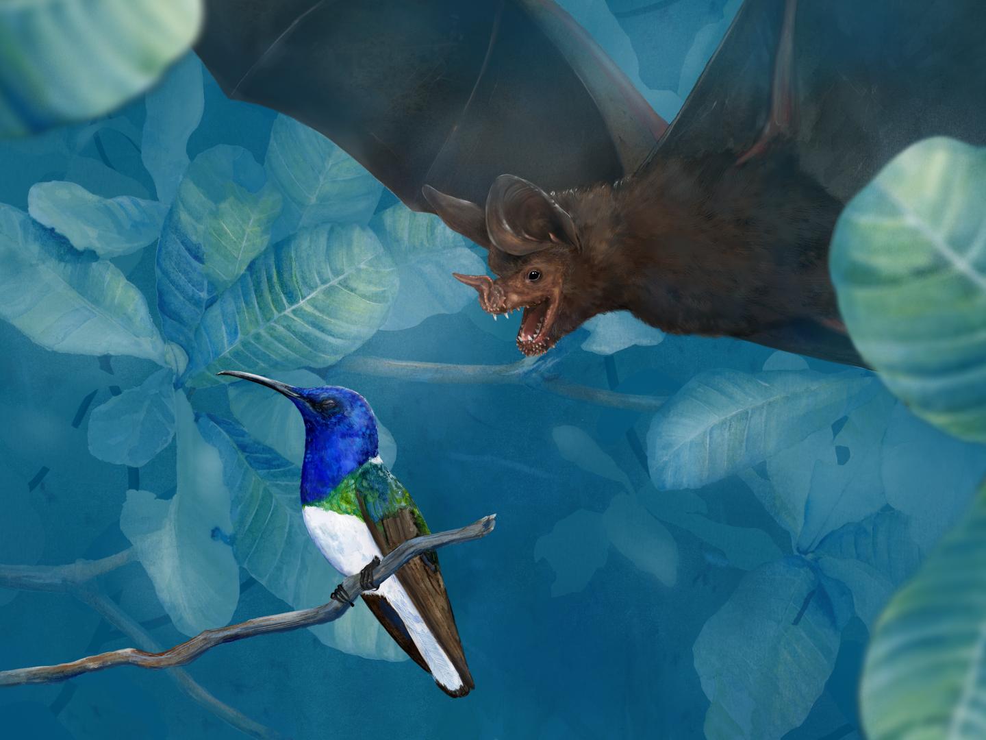 image: Hypothesized approach of a sleeping white-necked jacobin, Florisuga mellivora, by the fringe-lipped bat, Trachops cirrhosus.