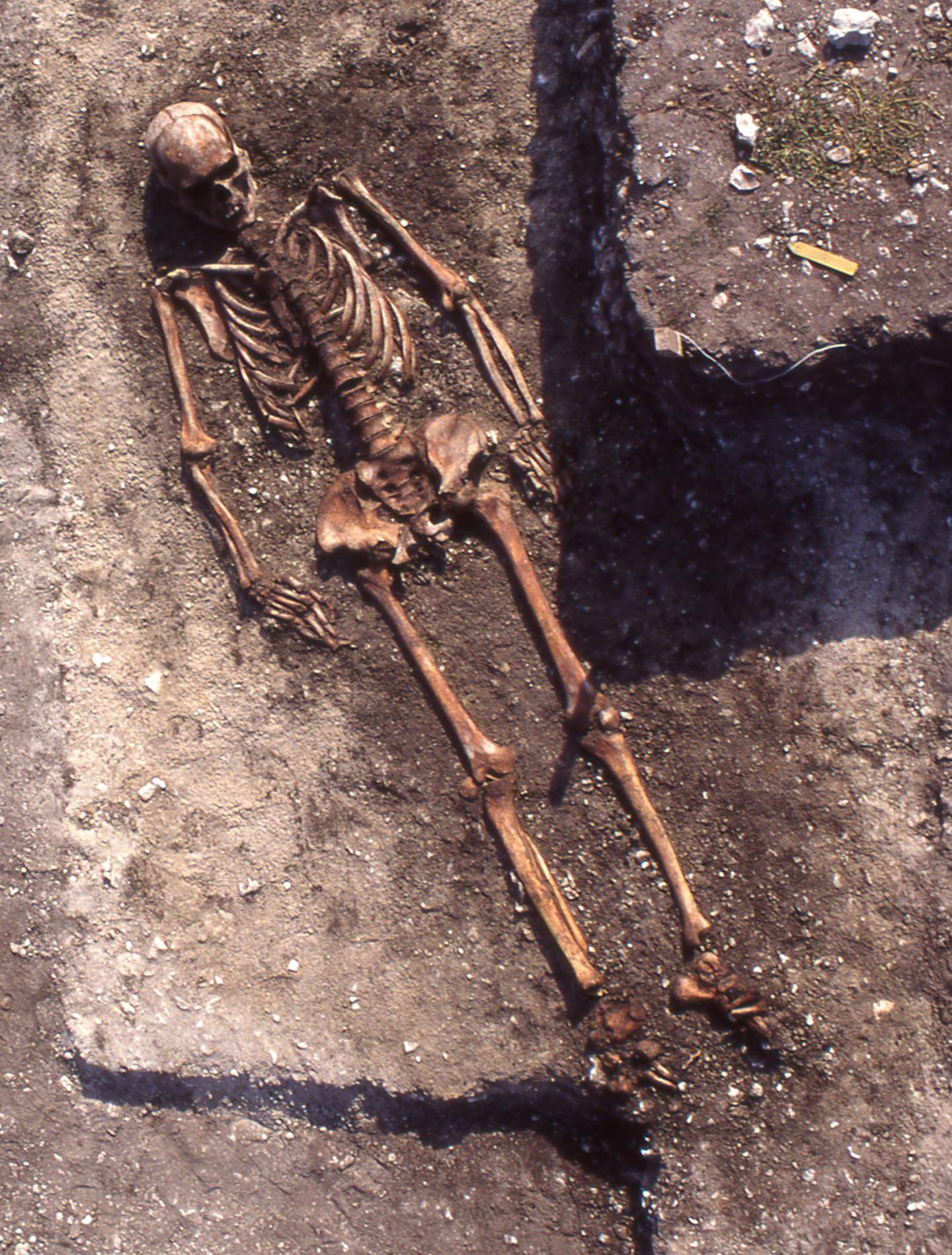 image: The man in grave 54 from the Ajvide Pitted Ware burial ground on Gotland is buried flat on his back, which is typical of Pitted Ware graves.