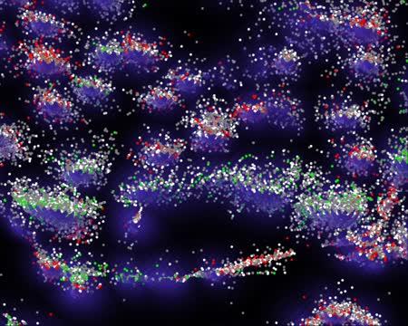 video: In this flyover of scatterplot data from DNA microscopy, scientists use an algorithm to determine the relative location of molecules (colored dots, classified by the molecules' gene sequences) at each point in space.