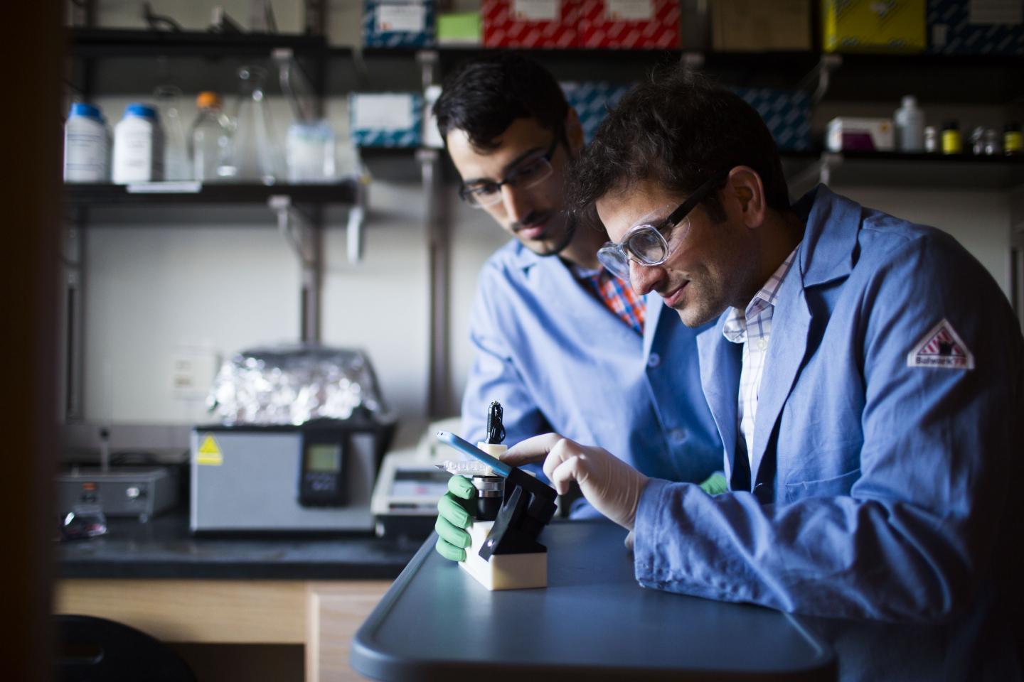 image: DNA mechanotechnology expands the opportunities for research involving biomedicine and materials sciences, says Khalid Salaita, right, professor of chemistry at Emory University and co-author of the article, along with Aaron Blanchard, left, a graduate student in the Salaita Lab.