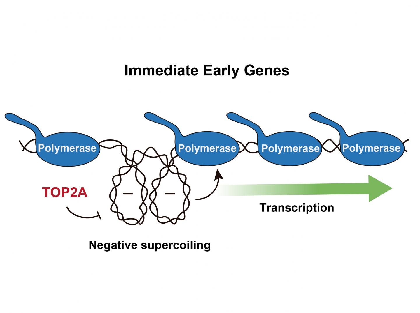 image: TOP2A relieves negative supercoiling at gene promoters, resulting thus in an increase in the number of twists of the DNA strands. This is an obstacle to the continuous opening of the helix that prevents the advance RNA polymerase, remaining in a poised state ready to trigger gene expression as soon as needed.