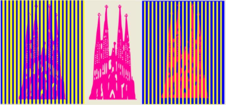 image: In all three cases, the Sagrada Familia is the same colour but looks different due to the surrounding colours. This is a visual illusion.