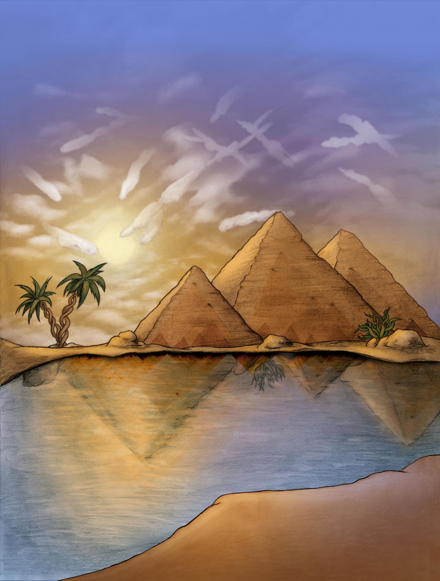 image: The pyramids represent chromatin domains in the wild-type situation. The reflection in the water below represents the rearrangements in the mutant fruit fly chromosomes. At first glance the (regulatory) landscapes look very similar, but there are lots of changes to the topology, and yet these have little impact on the nature of the landscape (gene expression) in many cases.