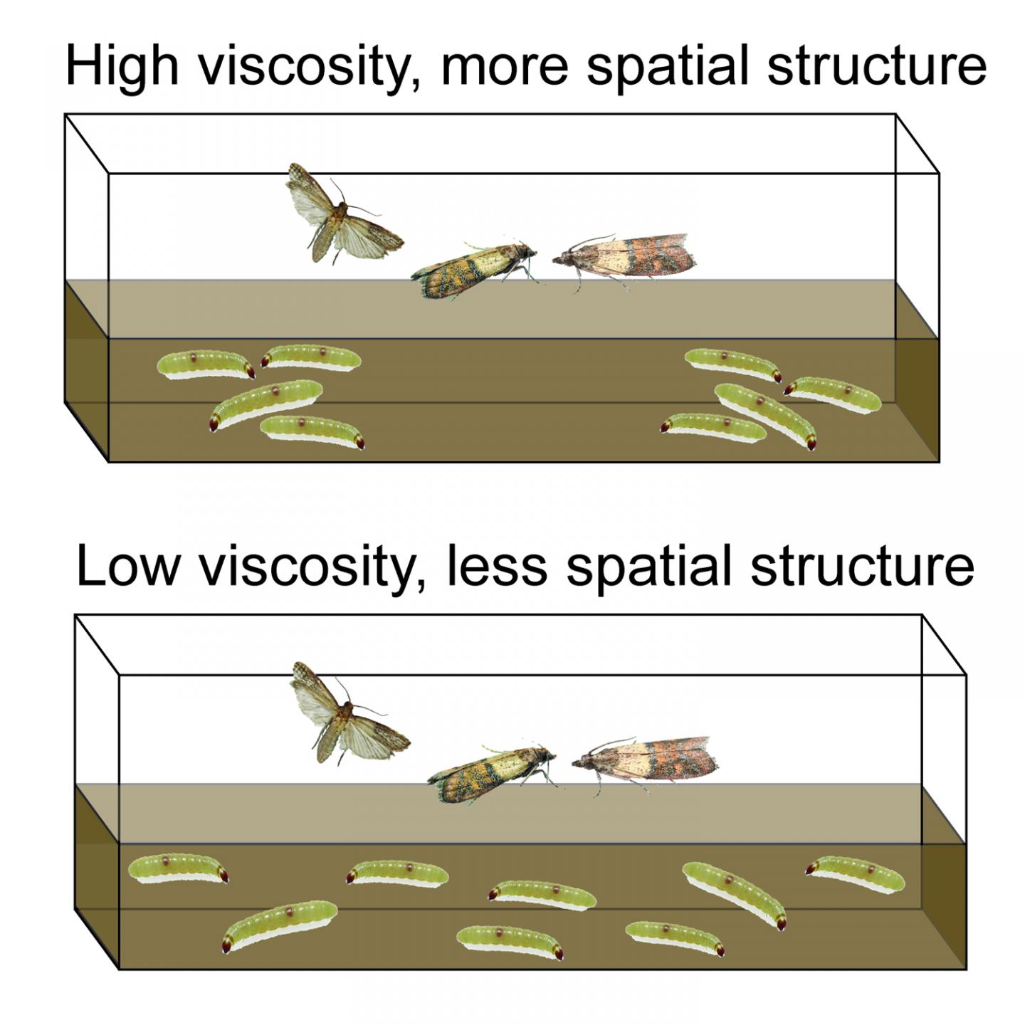 image: Indian meal moths were raised for successive generations in sealed enclosures where conditions were identical save for the stickiness of their food. In enclosures (top) where food was stickier, caterpillars were more likely to interact with siblings. Meal moths with more local interactions with siblings evolved less selfish behavior - as evidenced by lower rates of cannibalism - within 10 generations.
