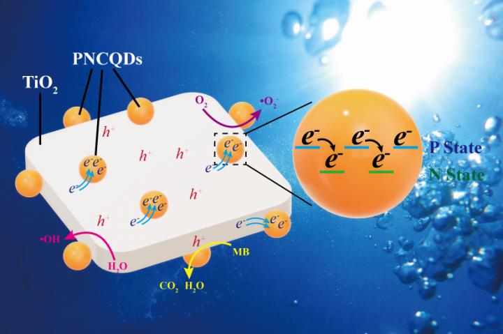 image: Photocatalytic process of phosphorus and nitrogen co-doped carbon quantum dots (PNCQDs)/TiO2 nanosheets. Due to the quantum wells created by synergy between N and P elements, photogenerated electrons can be localized to the dopant sites of PNCQDs, improving the quantum efficiency.