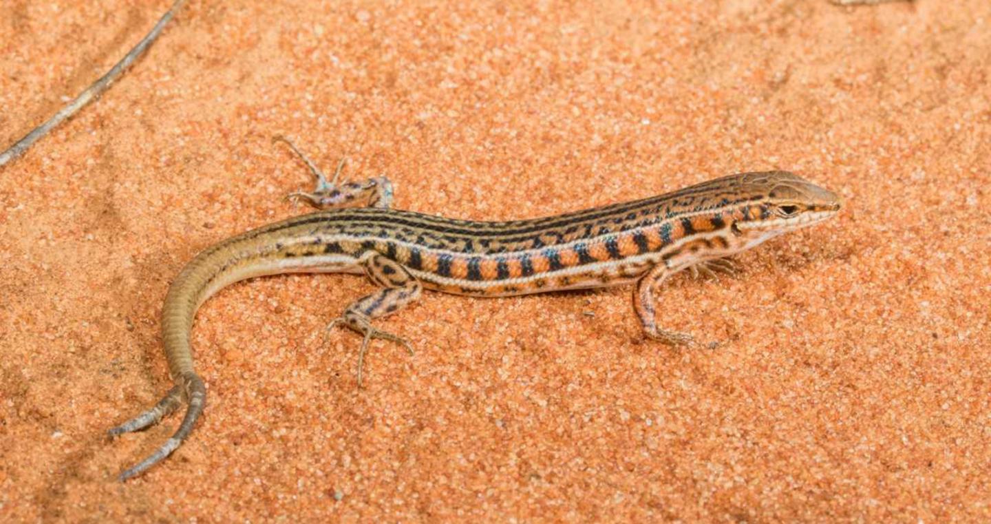 image: An image of an Australian barred wedgesnout skink lizard (Ctenotus schomburgkii) with two tails. Photo credit: Mr Damian Lettoof, Curtin University.