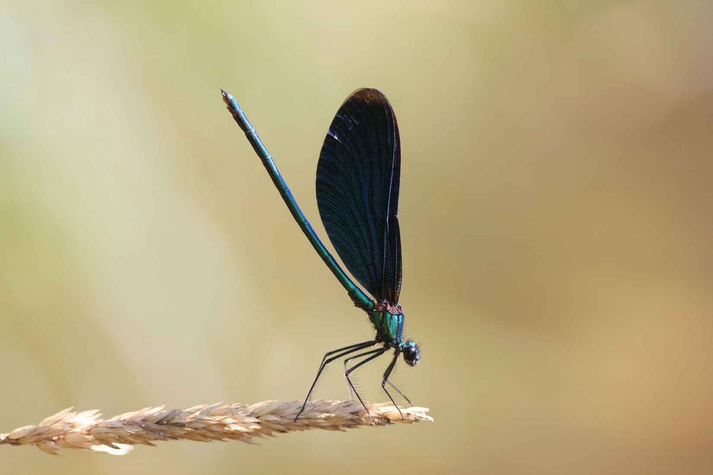 image: Calopteryx virgo breeds in rivers and streams and has been increasing since 1980 in Germany. This increase is reflecting a recovery from the impacts of past water pollution.
