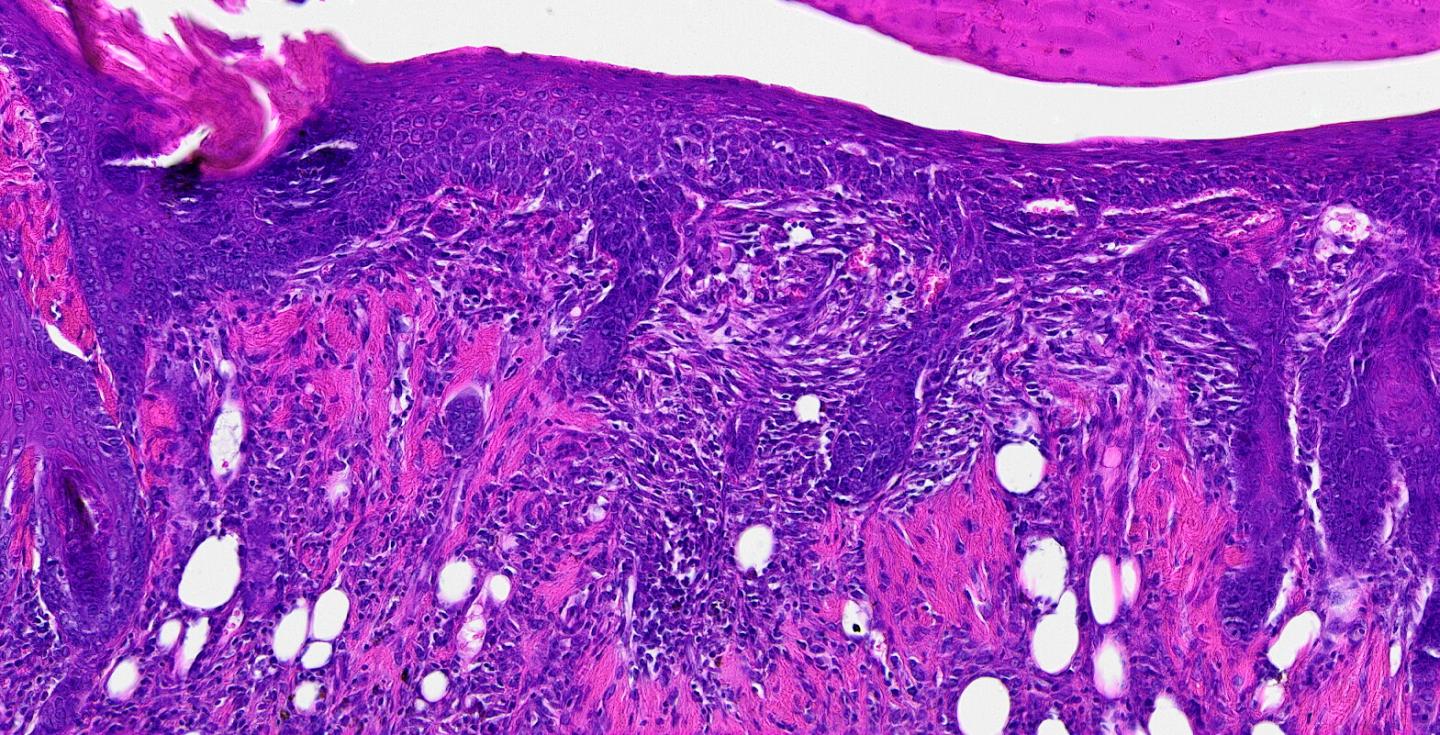 image: This is a tissue section 14 days post-wounding reveals the presence of hair follicles regenerating at the center of the wound. Re-growing hair follicles is one of the biggest challenges in the field of wound healing.
