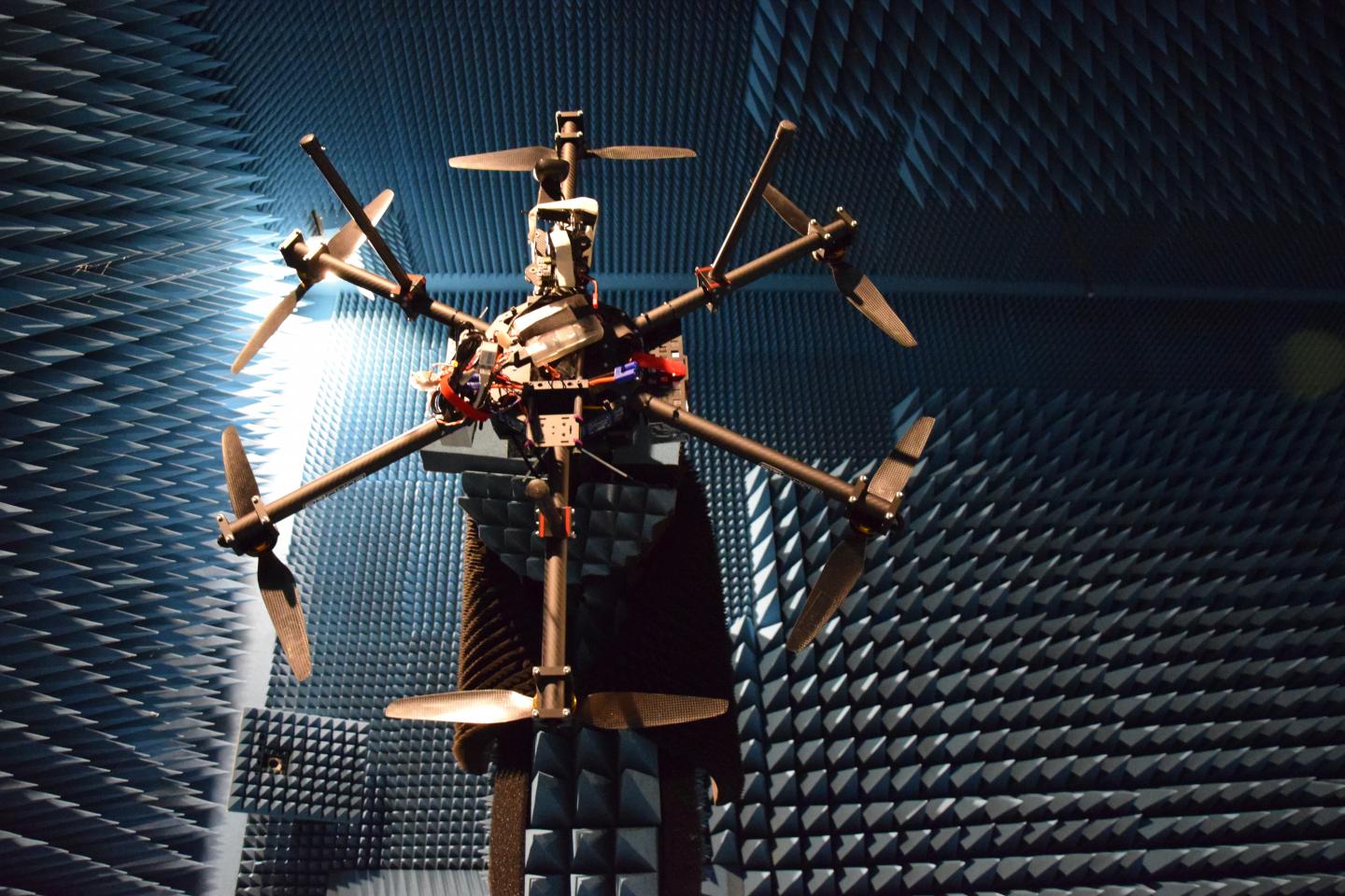 image: Measuring a drone's Radar Cross Section in Aalto University's anechoic chamber.