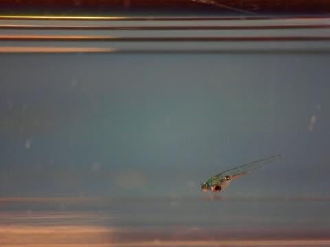 video: Five larvae were placed in the Petri dish. The video starts (00:00) with a close-up view on one larva near the base of the dish. Spontaneous swim behavior is observed after 1-2 seconds (00:01 - 00:02). After ?3 seconds (00:03), a metal probe was lowered behind the Petri dish (appears as a shadow in the background) to indicate the start of tapping on the rim of the dish. As tapping began (note movement of the liquid surface), the larva in the foreground and other larvae in the background (partially in focus) display swift escape response, consistent with normal hair cell function and hearing.