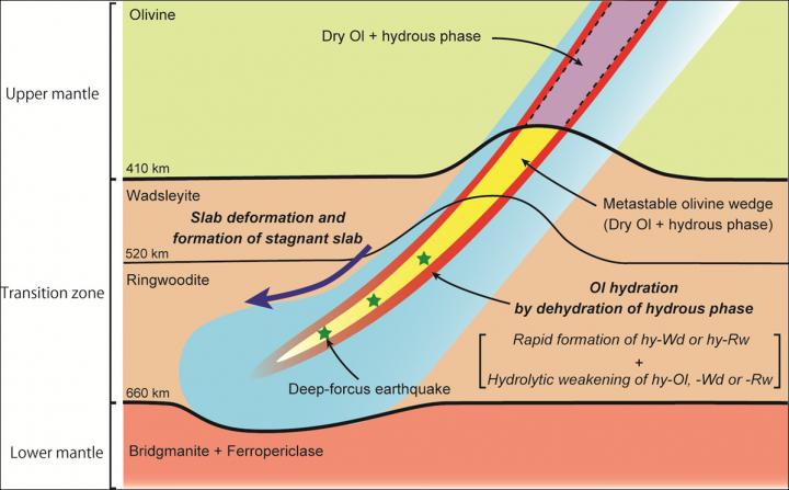 Their finding also newly suggests a novel hypothesis that mysterious phenomena of slab bending and stagnation in the deep interior are caused jointly by dehydration of hydrous silicates and the subsequent rapid phase transformation of olivine enhanced by their released water, due to hydrolytic weakening of olivine and its high-pressure polymorphs.