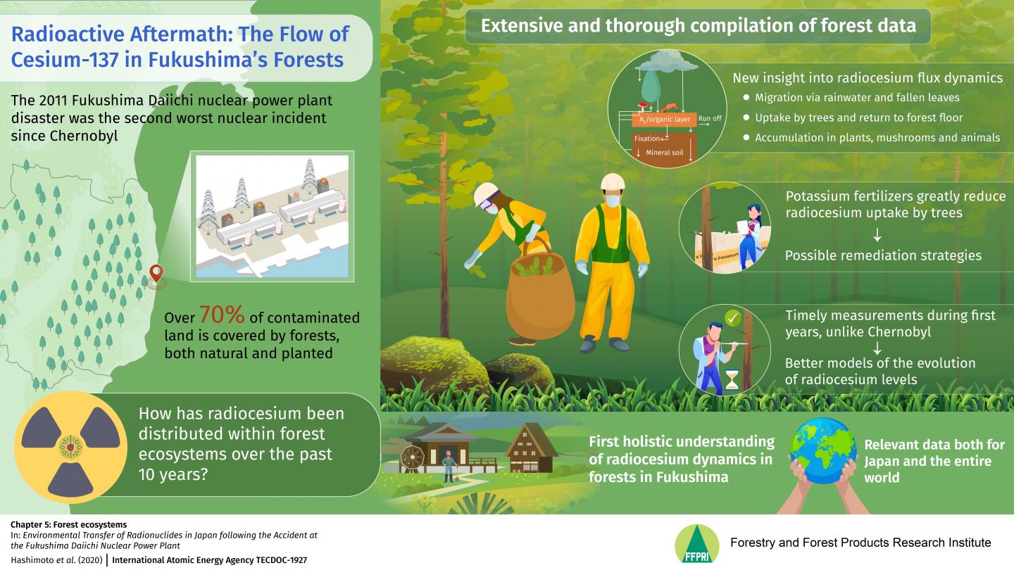 Understanding how long radionuclides like 137Cs can remain in ecosystems and how far they can spread is essential to implement policies to protect people from radiation in Fukushima-sourced food and wood. In addition, the article also explores the effectiveness of using potassium-containing fertilizers to prevent the uptake of 137Cs in plants. "The compilation of data, parameters, and analyses we present in our chapter will be helpful for forest remediation both in Japan and the rest of the world," remarks Hashimoto.