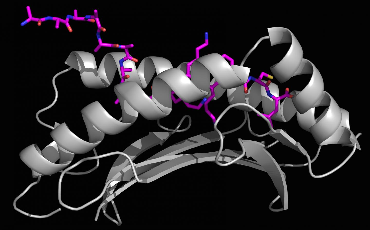 image: X-ray crystallography generated image of a long foreign peptide (purple) being partially held inside MHC I protein's surface groove (grey).