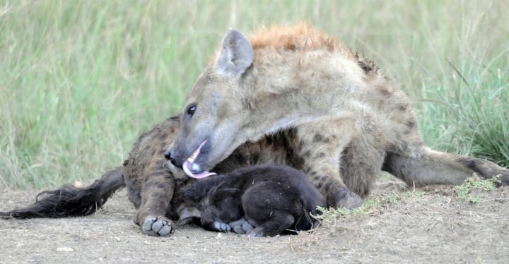 image: Hyena mom licking her cub in Kenya's Masai Mara National Reserve.
