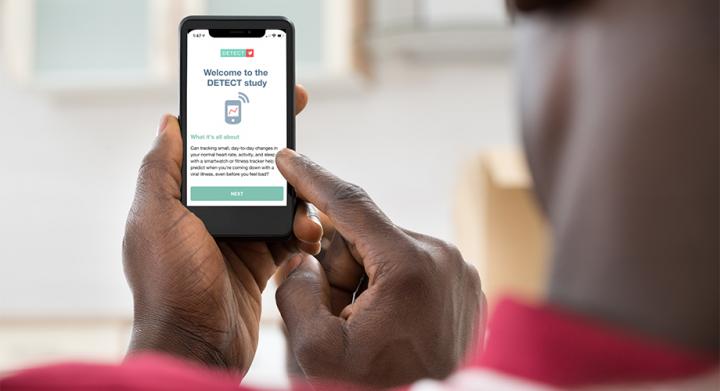 image: The DETECT study uses a mobile app to collect smartwatch and activity tracker data from consenting participants, and also gathers their self-reported symptoms and diagnostic test results. Any adult living in the United States is eligible to participate in the study by downloading the research app, MyDataHelps.