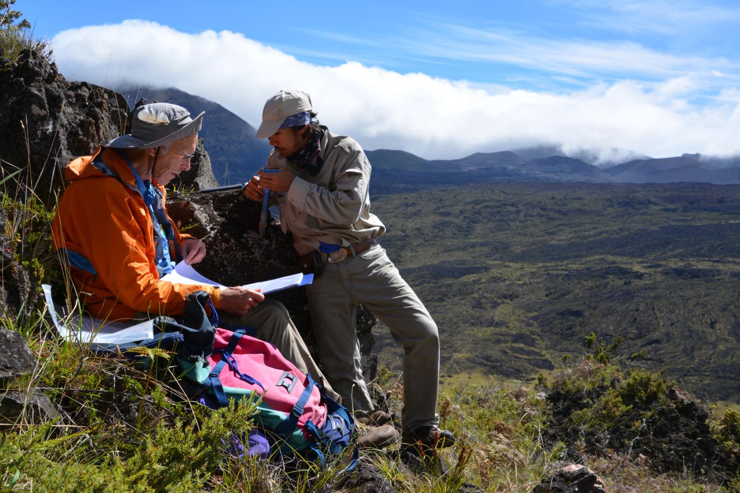 image: Study co-author Rob Coe and Trevor Duarte orienting cores from a lava flow site recording the Matuyama-Brunhes magnetic polarity reversal in Haleakala National Park, Hawaii, in 2015.