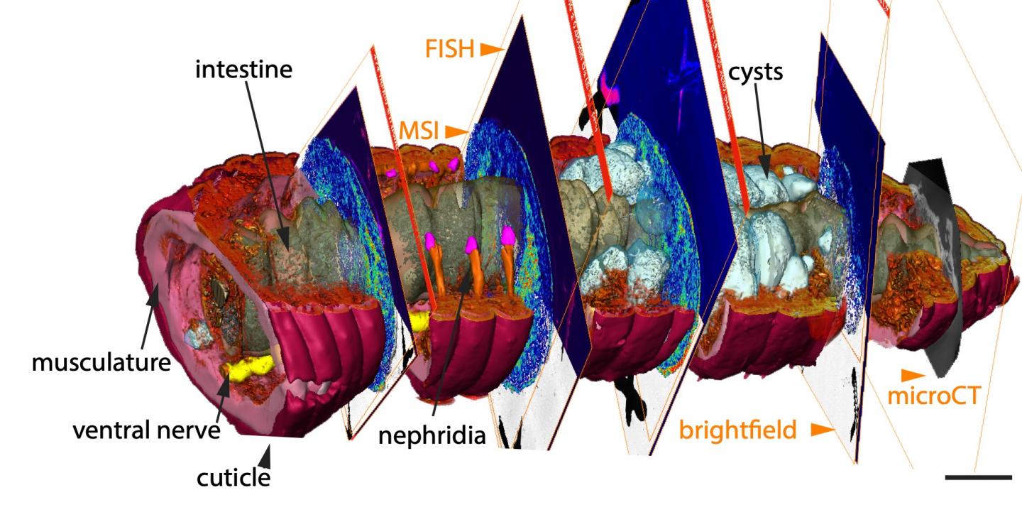 The new combination of high-resolution imaging techniques can offer a solution to this problem, as the research team now shows. "In our study, we introduce chemo-histo-tomography, a special three-dimensional imaging approach of the chemistry and anatomy of millimeter-sized animals and their parasites at a cellular level," says Benedikt Geier, first author of the paper. "This method offers a new strategy to visualize the most fundamental processes - metabolic interactions - in small animal symbioses. It allows us to spatially assign metabolic producs to the animal host and its microbial partners at the micrometer scale."
