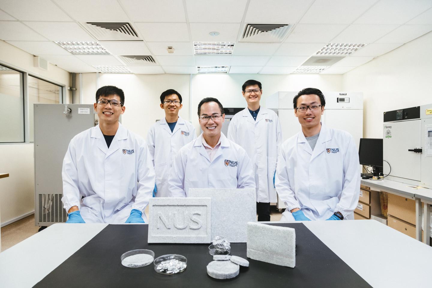 image: A team of researchers led by Associate Professor Duong Hai-Minh (seated, centre) from the National University of Singapore has developed a simple, cost-effective and eco-friendly technique to upcycle metal waste into multi-functional aerogels. Team members are: Goh Chong Jin (seated, left), Ong Ren Hong (seated, right), Nguyen Thai Thien Phuc (back, left) and Goh Xue Yang (back, right).