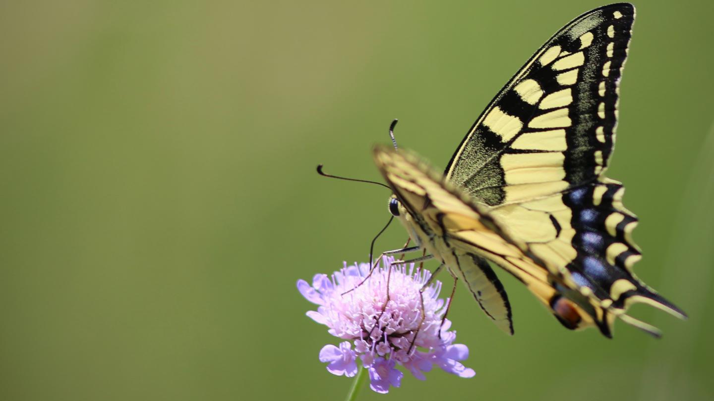 image: Picture of a swallowtail (Papilio machaon) (family Papilionidae), whose caterpillars eat the plant family Apiaceae (this includes the carrot, celery or fennel), which contain toxins. In humans, these toxins are carcinogenic and cause severe burn-like symptoms.