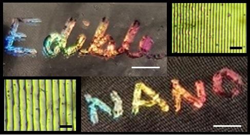 image:Â Nanostructures (yellowish-green images; scale bar, 5 μm) were patterned onto dried corn syrup films, producing edible, rainbow-colored holograms (scale bar, 2 mm).
