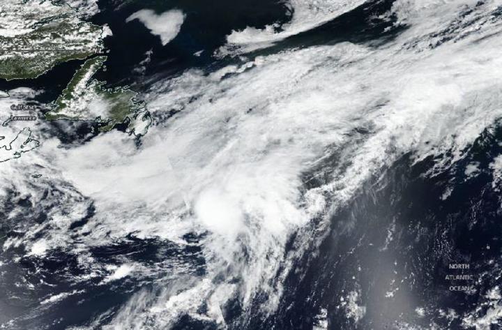image: On July 6, NASA-NOAA's Suomi NPP satellite provided a visible image of Post-Tropical Cyclone Edouard merging with a frontal boundary in the Northern Atlantic Ocean.