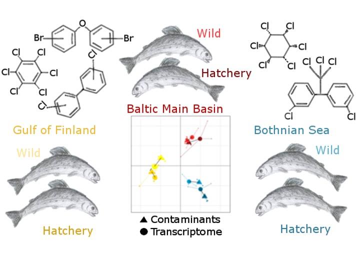 Hatchery-reared Atlantic salmon (Salmo salar) have been released to support the wild salmon stocks in the Baltic Sea for decades. During their feeding migration, salmon are exposed to organohalogen compounds (OHCs). Here, we investigated the OHC levels and transcriptome profiles in the liver of wild and hatchery-reared salmon collected from the Baltic main basin, the Bothnian Sea, and the Gulf of Finland and examined whether salmon origin and OHC levels contributed to the hepatic transcriptome profiles. There were no differences in the OHC concentrations and transcriptome profiles between wild and hatchery-reared fish but there were large differences among the areas. Several transcript levels were associated with polychlorinated biphenyls, chlordanes, and dichlorodiphenyltrichloroethane in a concentration-dependent manner. When comparing the different areas, lipid metabolism, environmental stress, cell growth and death-related pathways were enriched in the liver transcriptome. Coinertia analysis, a multivariate method, showed that the covariation in the OHC levels and the transcriptome were significantly similar. These results suggest that the hepatic transcriptomes in wild and hatchery-reared salmon are more affected by the OHC level than the salmon's origin. This paper was published in an American Chemical Society Journal, Environmental Science and Technology on November 9, 2020.