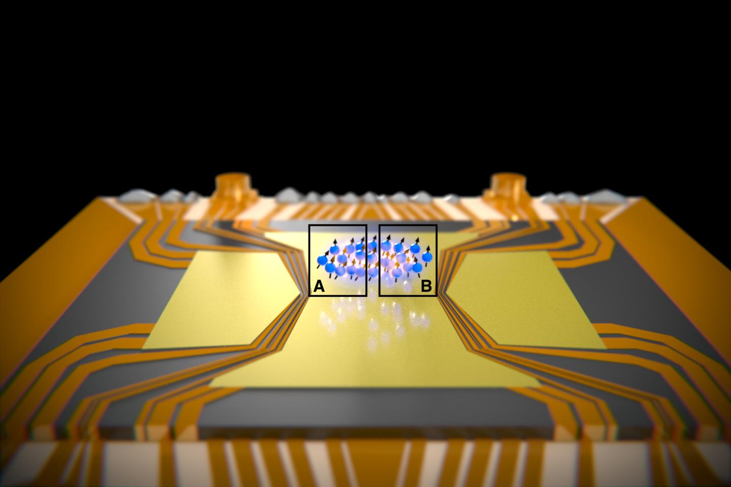 image: A cloud of atoms is held above a chip by electromagnetic fields. The EPR paradox was observed between the spatially separated regions A and B.