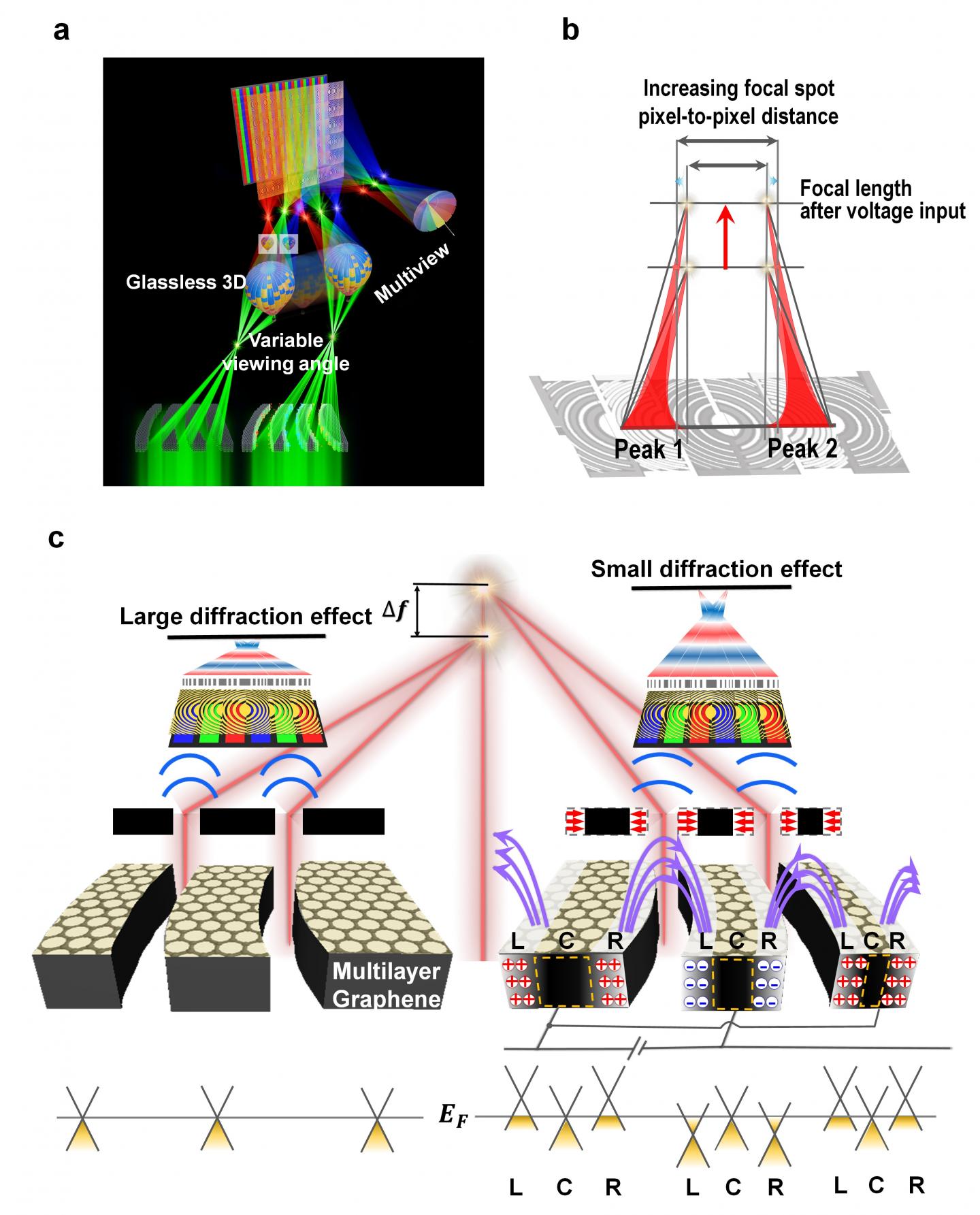 image: a Illustration of applying the ETF-USSL in a display. The USSL enables multifocusing, allowing implementation of glassless 3D and multiview displays, and the ETF characteristics enable a variable viewing angle. b, the spot intensity depends on the distance along the z-axis and the distance in the lateral direction between the focal spots of peaks 1 and 2. At a fixed focal length position, the maximum intensity of the focal spot decreases as the focal length of the USSL becomes longer owing to the driving voltage. c Schematic of the tuneable focal length when a DC voltage bias is applied to graphene in the in-plane direction. In the ribbon made of graphene, the centre area (C) absorbs the light, and the carrier are concentrated in the left side (L) and right side (R) due to the DC bias; thus, the Fermi level is far from the Dirac point, and light is not absorbed and transmitted. Consequently, the change in the nanoribbon width via an external electric field effectively modulates the FZP topology, thereby changing the focal length of the lens.