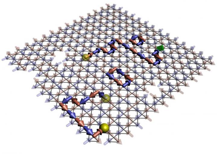 image: Researchers have used a D-Wave quantum-annealing computer as a testbed to examine the behavior of emergent magnetic monopoles. Shown here, emergent magnetic monopoles traverse a lattice of qubits in a superconducting quantum annealer. Nonzero flux programmed around the boundary creates a trapped monopole in the degenerate ground state.