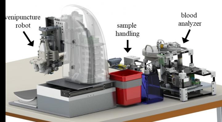 Researchers from the Biomedical Engineering Department at Rutgers University have developed an end-to-end blood testing device that integrates robotic phlebotomy with downstream sample processing. This platform device performs blood draws and provides diagnostic results in a fully automated fashion at the point-of-care. By reducing turnaround times, the device has the potential to expedite hospital work-flow, allowing practitioners to devote more time to treating patients. The research has been published in a paper in the June 2018 issue of TECHNOLOGY.