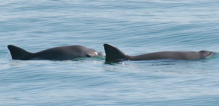 image: A vaquita and her calf surface in the Gulf of California.