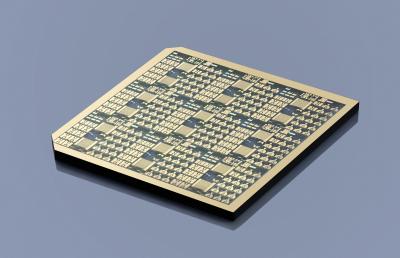 image: Gallium oxide chip with transistor structures and for measurement purposes, processed at FBH via projection lithography.