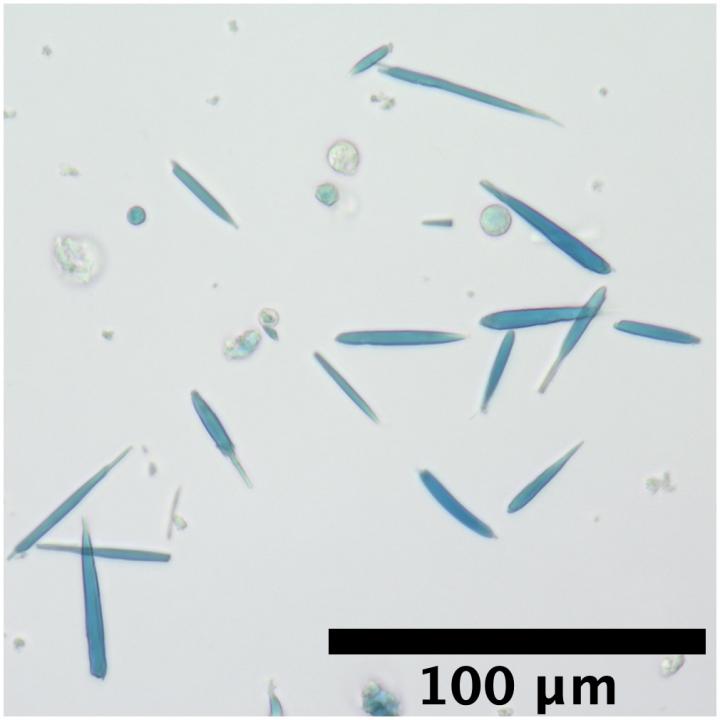 image: These magnetic protein crystals, isolated from cells, were stained with a blue dye that binds to iron.