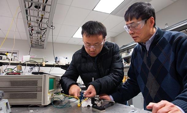 image: Xin Chen, a doctorate candidate in the Department of Materials Sciences and Engineering at Penn State, and Qiming Zhang, distinguished professor of electrical engineering, test a film capacitor in this photo taken in January.