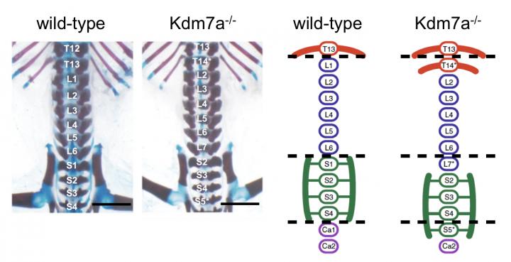 The researchers analyzed postnatal skeletal preparations of both wild-type and Kdm7a-/-mice. Dr Yasuharu Kanki, senior author, describes the findings. "As expected, all wild-type mice showed a normal axial skeleton. Interestingly, all Kdm7a?/? mice and some heterozygous mutants exhibited vertebral transformation; some vertebrae assumed the characteristics and appendages of their anterior neighbors."