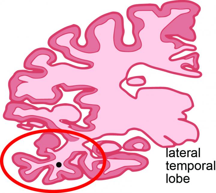 image: Coronal section of human brain indicating the lateral temporal lobe (red circle) used in this study.