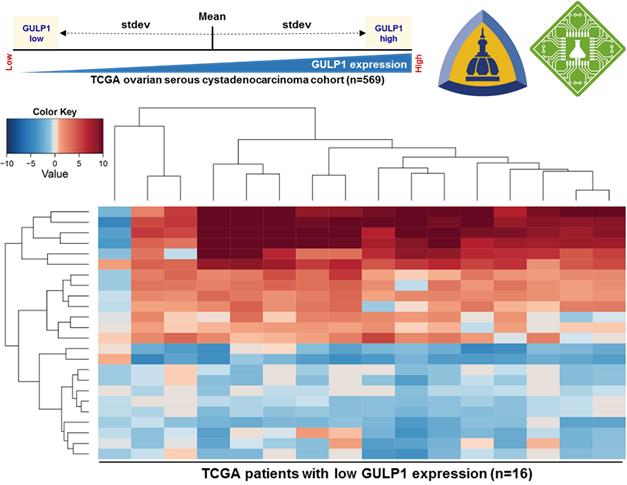 It was found that in at least one third of over 400 ovarian cancer cases analyzed, GULP1 is methylated. Inverse correlation of GULP1 methylation with expression was also observed in the TCGA data set, further validating these findings. Furthermore, GULP1 methylation was associated with late stage disease, and worse overall survival, suggesting that GULP1 expression plays an important role in ovarian cancer pathogenesis. This also sheds light on the mechanisms underlying GULP1-mediated growth suppression. The authors used iPANDA, a bioinformatics software suite for analysis of intracellular signaling pathway activation based on transcriptomic data (developed by InSilico Medicine, a biotechnology company located on the Johns Hopkins University of Montgomery County Campus that focuses on artificial intelligence-driven drug and biomarker discovery platforms), to compare signaling profiles between GULP1-low-expressing and GULP1-high ovarian tumors in TCGA ovarian cancer dataset. This analysis has predicted that mitogenic and survival signaling pathways, such as AKT, MAPK/ERK, RAS, ILK, PAK/P38, WNT and JNK were significantly upregulated among GULP1-low tumors. These pro-survival signaling axes play a crucial role in cancer initiation, progression and maintenance in various solid tumors, including ovarian cancer, and may contribute to acquisition of an aggressive phenotype via inhibition of apoptosis and induction of cell proliferation. In line with these observations, pro-apoptotic and anti-proliferative pathways including those associated with TP53 and TGF-β signaling were predicted to be downregulated in most of the GULP1-low tumors. In accordance with the in-silico analysis, reconstitution of GULP1 expression in vitro resulted in marked suppression of MAPK and AKT phosphorylation, along with concomitant reduction in cell proliferation, survival and invasion, while GULP1 depletion led to opposite effects. Taken together, these findings indicate that GULP1 may assert tumor suppressive activities by tethering members of multiple, cross-talking pathways involved in cell growth and survival control.