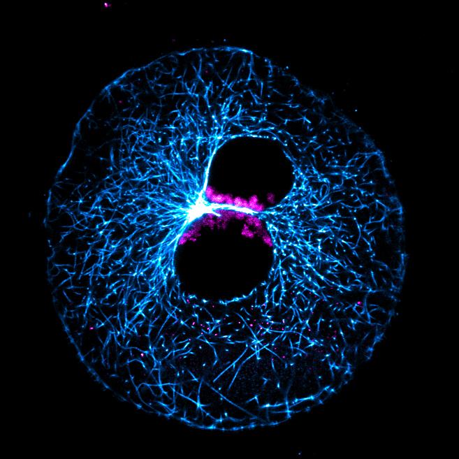image: A bovine egg after fertilization: The parental genomes are still located in two separate pronuclei. Before unification, the chromosomes (magenta) cluster at the pronuclear interface. Part of the cytoskeleton is colored blue. Super resolution microscopy image.