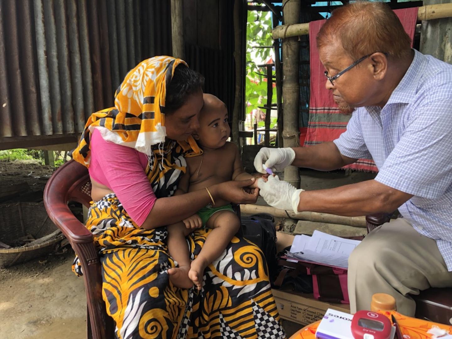 image: Md. Sadiquzzaman, a long-time employee of ICDDR,B and field assistant with the Shodagor Longitudinal Health and Demography Project, collecting whole capillary blood via finger prick from a Shodagor woman and her son. Blood from finger pricks was used to conduct point-of-care tests that would determine risk of diabetes and anemia. Collection of biomedical data, as part of the larger project, was motivated by requests from members of the Shodagor community to gain more knowledge about their health status and, especially, the health status of their children.