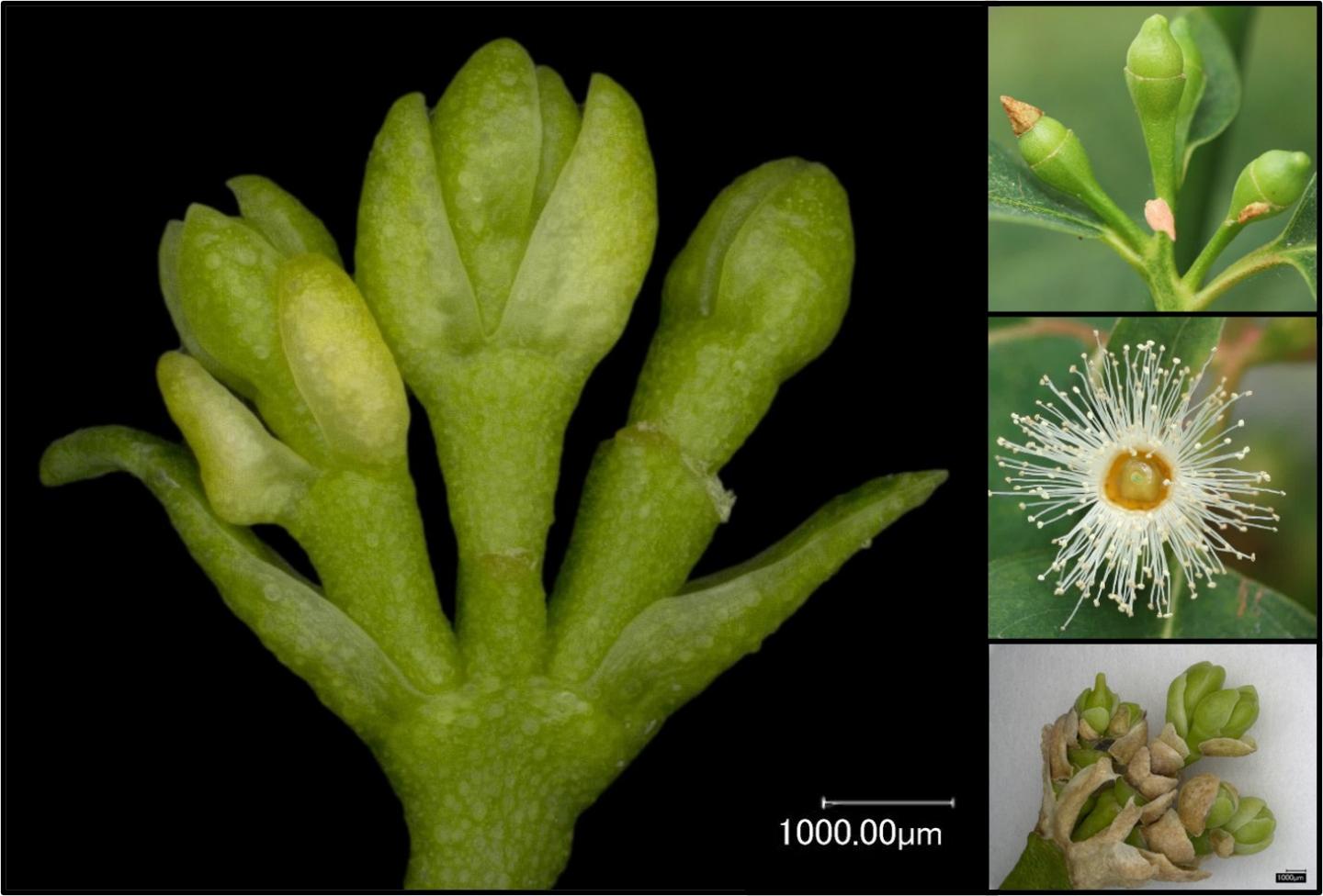 image: Image of a modified set of eucalypt floral buds that do not develop further to make viable pollen or seeds (main image and lower right), compared to wild type flower buds (upper right) and open flower (middle right)