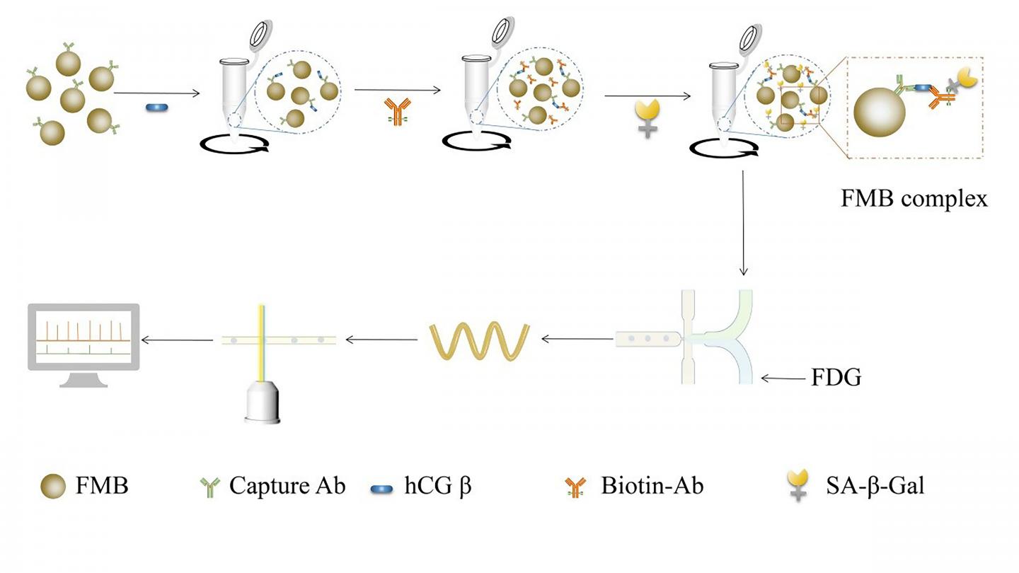 image: Diagram of hCGβ detection by microfluidic droplet and multicolor fluorescence detection