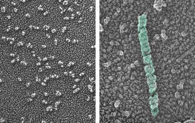 The building blocks of von Willebrand Factor remain separate at the slightly basic pH of 7.4 (left). In a more acidic environment (right), the VWF building blocks self-assemble into long chains and form the protein's signature helical tubules. This shape is vital to blood clotting. When VWF in the blood finds sites of injury, its helical tube unfurls to catch platelets and form blood clots.