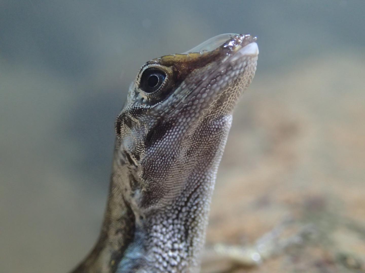 image: Close-up of an Anolis lizard with a rebreathing bubble on its snout.