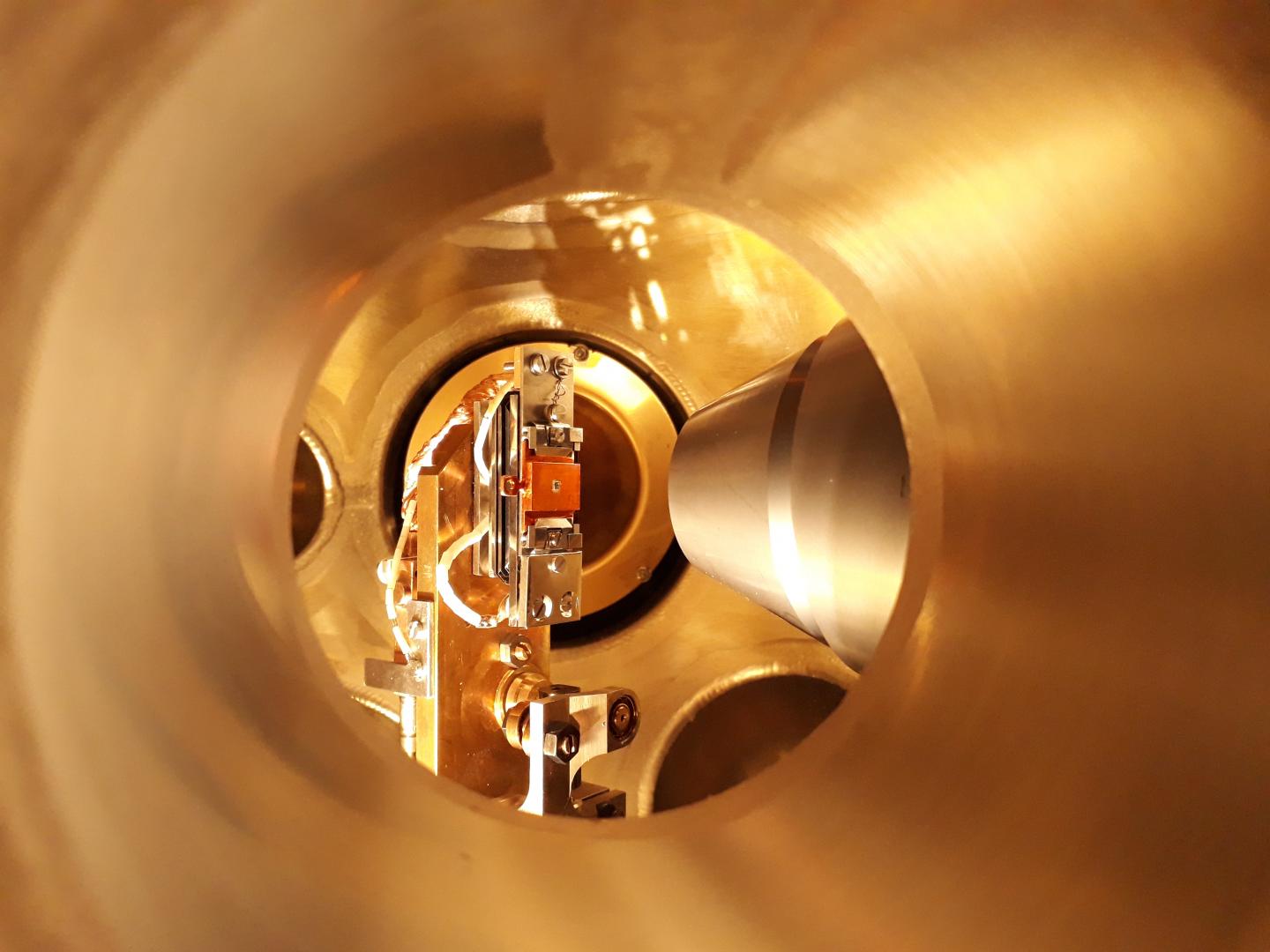 image: Topological materials such as tungsten ditelluride, here a sample in an ultra-high vacuum chamber, have special electronic properties and are very robust against external perturbations.