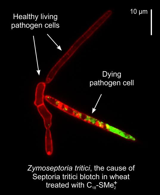 Most importantly, the Exeter researchers demonstrate that C18-SMe2+ shows no toxicity to plants and is less toxic to aquatic organisms and human cells than existing fungicides sprayed used in the field today.