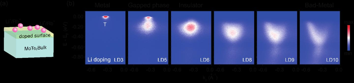 The experiments were conducted in a self-constructed ARPES system in Peking University and Beamline BL03U in Shanghai Synchrotron Radiation Facility (SSRF). By using the surface deposition technique, Zhang Yan's group created a 2D metal-semiconductor interface between the surface and bulk layers in 2H-MoTe2 [Fig. 1(a)]. Generally, when carriers are filled into the conduction bands of a semiconductor, the chemical potential raises and the conducting bands shift rigidly towards higher binding energy. However, at the surface of 2H-MoTe2, the researchers found that the conduction bands undergo multiple transitions with the carrier doping across the metallic state, gapped phase, insulator state, and bad-metallic state [Fig. 1(b)]. Such evolution of electronic structure cannot be explained by the change of chemical potential or surface degradation, suggesting the existence of an exotic metal-insulator transition at the surface of 2H-MoTe2.