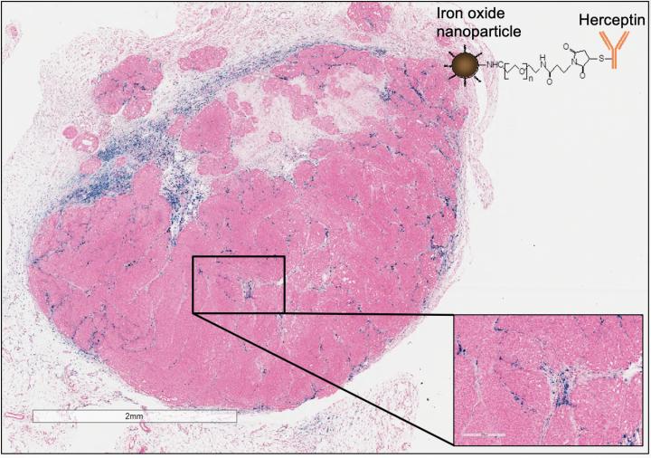 image: Histology image of HER2+ tumor showing accumulation of Herceptin-labeled nanoparticle (upper right, and blue in histology) accumulation in tumor microenvironment (immune) and not on HER2+ cancer cells.
